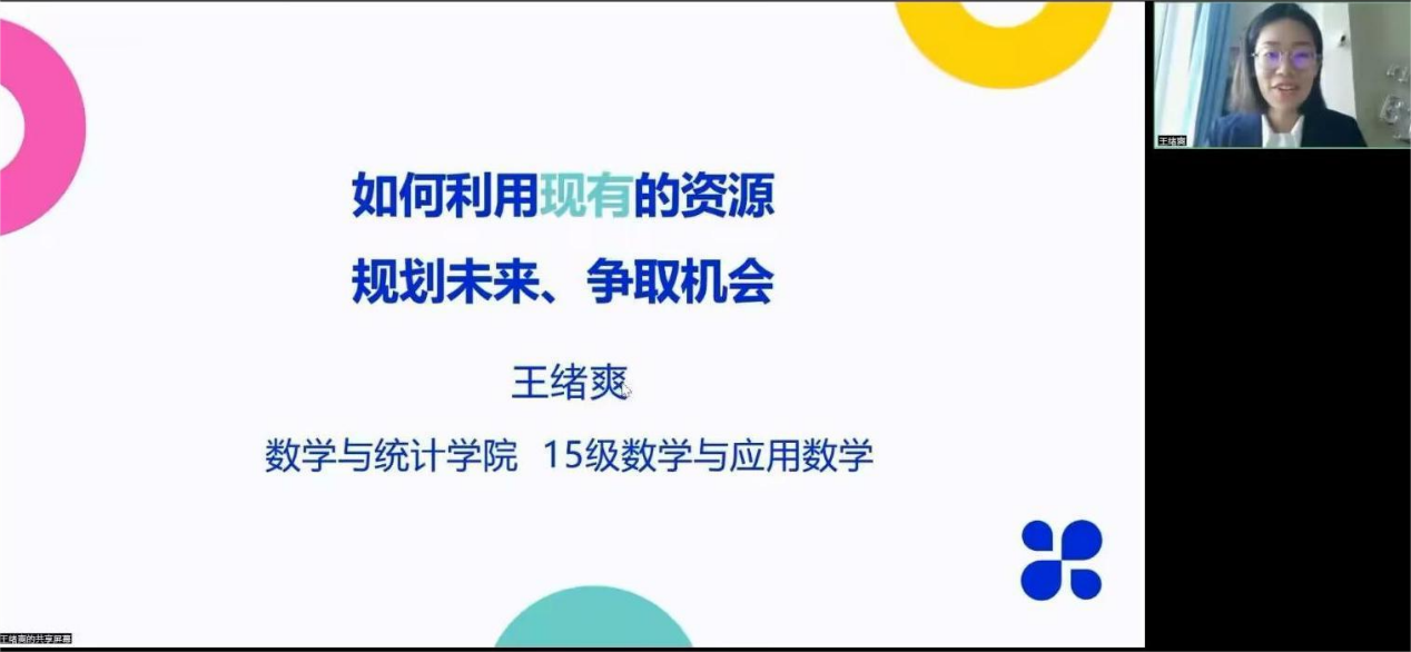 11月25日下午14:30,必赢76net线路官网第三期李子湖沙龙在线上进行。应数学与应用数学系系主任胡进老师邀请,公司2019届优秀毕业生王绪爽为全院师生作“如何利用现有资源规划未来、争取机会”的主题报告分享交流会。本次报告由胡进老师主持,包括陈晓丰老师、李华老师在内的200余名师生参与了此次报告交流会。